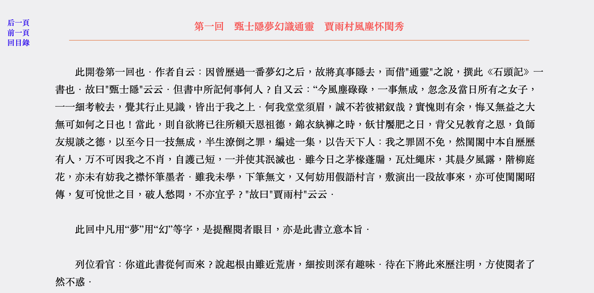 Once you accessed the structure of the webpage, it is time to play hide and seek and look for one book, let’s sat the first one: 紅樓夢 (Dream of the Red Chamber). You will find these lines: